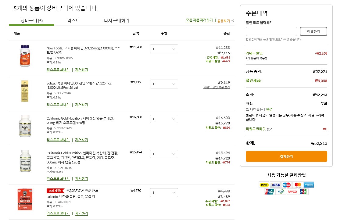 제가 고른 상품중엔 할인되는 게 별로 없지만 ^^ 품절된게 있어서 못산것도 있지만 그래도 내가 사고 싶은 걸로 담아 봤어요.