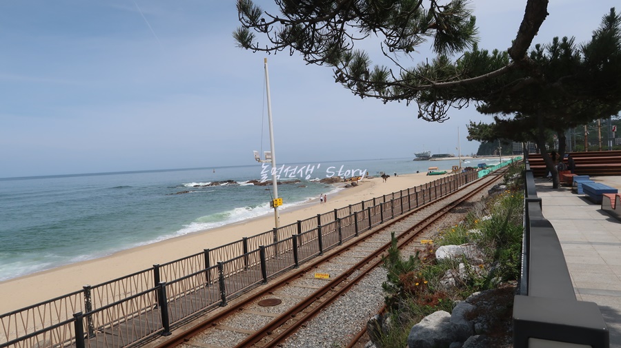 정동진 역의 매력은 뭐니 뭐니 해도 역 앞에 바로 해변이 펼쳐져 있다는 것이죠. 해안으로 나가는 길은 따로 또 있답니다. 모래시계 드라마 배경으로 유명해진 이곳이니만큼 드라마에 나왔던 소나무는 아직도 건재합니다.