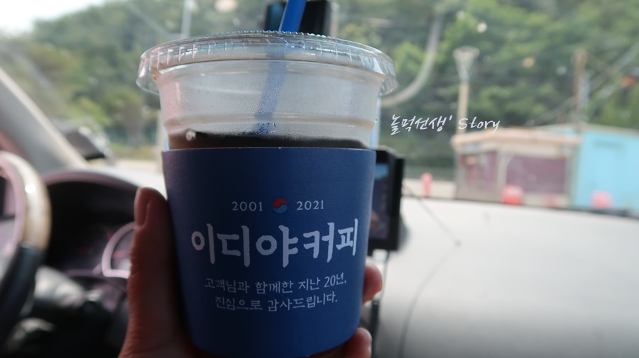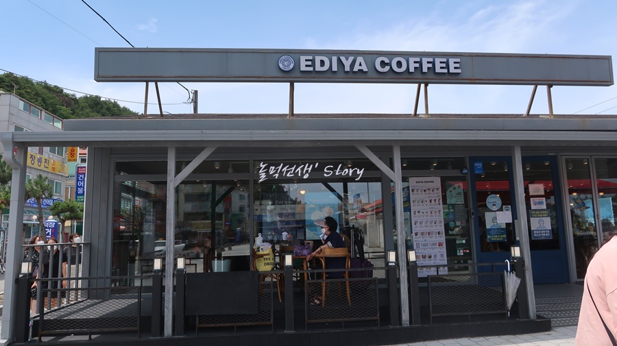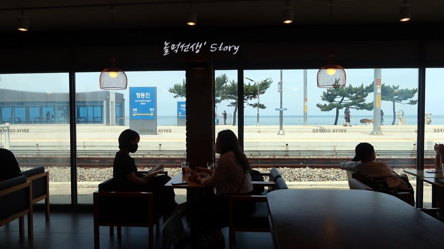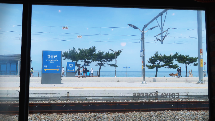 그리고 정동진 역 앞에 위치한 이디야 커피입니다. 겉에서 보기엔 그냥저냥 이었는데 안 들어갔으면 이 멋진 광경을 못 봤을 거예요. 날이 너무 무더워서 아이스커피가 마시고 싶어서 테이크 아웃하러 들어갔는데 한쪽 창을 통해서 이렇게 철도와 바다의 모습이 한눈에 보이더라고요~~ 정말 뷰가 최고였습니다.