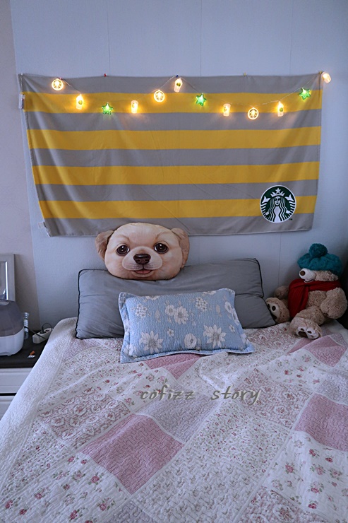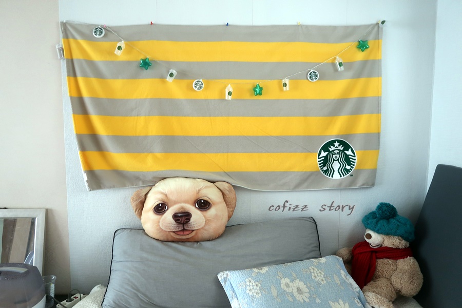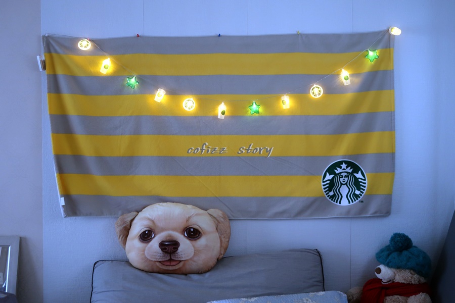 조명이 들어오면 이런 분위기가 난다. 확실히 낮보다는 밤이 더 예쁜 가랜드! 그래도 너무 나 스벅이요 하는 것보다는 또 다르게 보면 이런 심플한 게 낫기도 하는데 그래도 약간 뭔가 허전해서 예쁘게 꾸밀 것을 찾아봐야겠다는 ~ 줄 사이사이 뭔가 길게 늘어지는 것을 걸어 놔도 예쁠 것 같긴 하네.