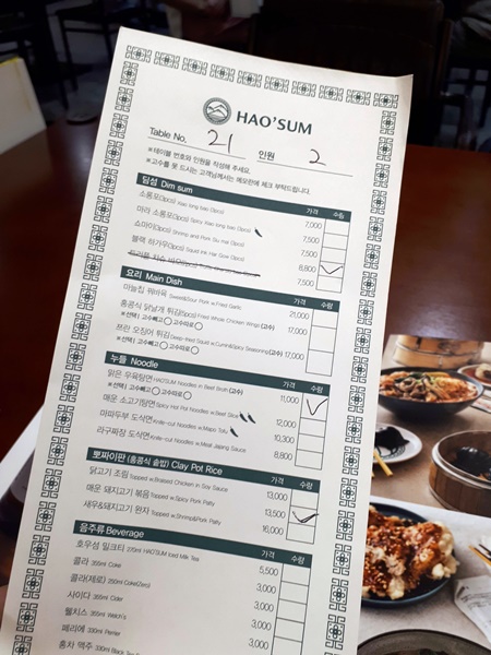 요즘 이런 지류 주문서 오랜만이다. 직원분이 주문서와 볼펜을 가져다주는데 원하는 곳에 체크를 해서 계산대에서 계산을 하고 주문서는 다시 가져오기 ~ 암튼 우리는 세 가지 메뉴 주문 완료다