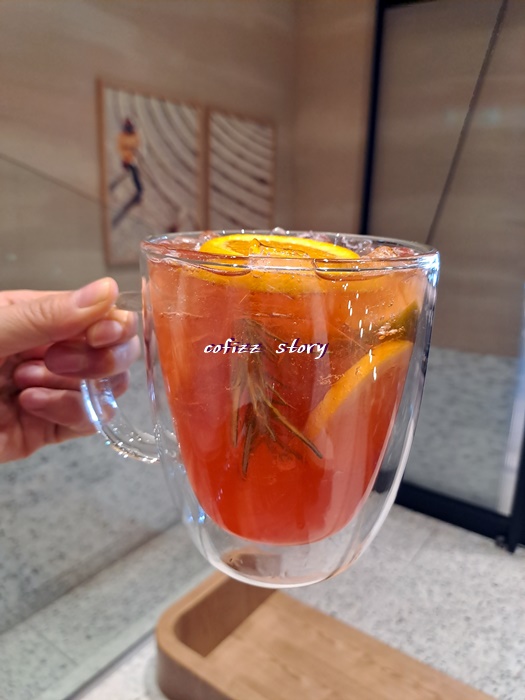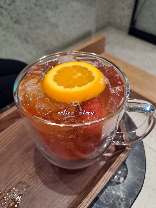 짠 대망의 블루밍 프루트 유스베리티입니다. 안에 사과 방울 토마토, 오렌지, 레몬, 라임등 과일 조각이 들어가 있는데 라임은 일단 손으로 짜서 섞어서 마시고 나머지는 나중에 먹어줬지요. 8500원이라는 무시무시한 가격이지만 상콤하니 맛이 좋았어요. 다음에 또 마시고 싶은 음료입니다. 아이스로 마셨지만 따뜻하게 마셔도 맛있을 듯 합니다. 음료양도 꽤 많아서 한참 마셨어요.