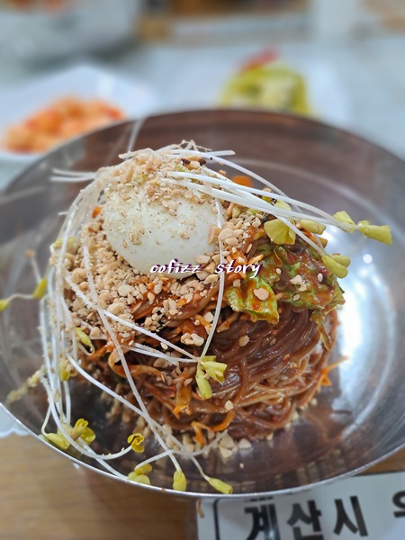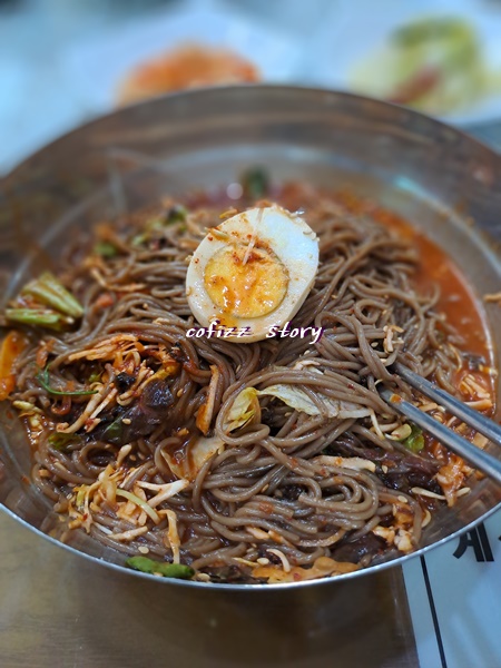 특이하게 양념이 완전히 비벼져서 나오는데요. 편하기는 했지만 내 입엔 양념이 조금 찐해서 차라리 따로 나오면 좀 양념장을 덜고 비빌수 있는데 싶은 아쉬움이 있었어요. 비빔이라도 육수도 같이 나오기에 이렇게 자작하게 비빔으로 먹을 수 도 있고 위에 올려져 나오는 메밀싹이 또 별미더라고요. 다음엔 양념을 좀 덜 넣어달라고 주문해야 겠어요..