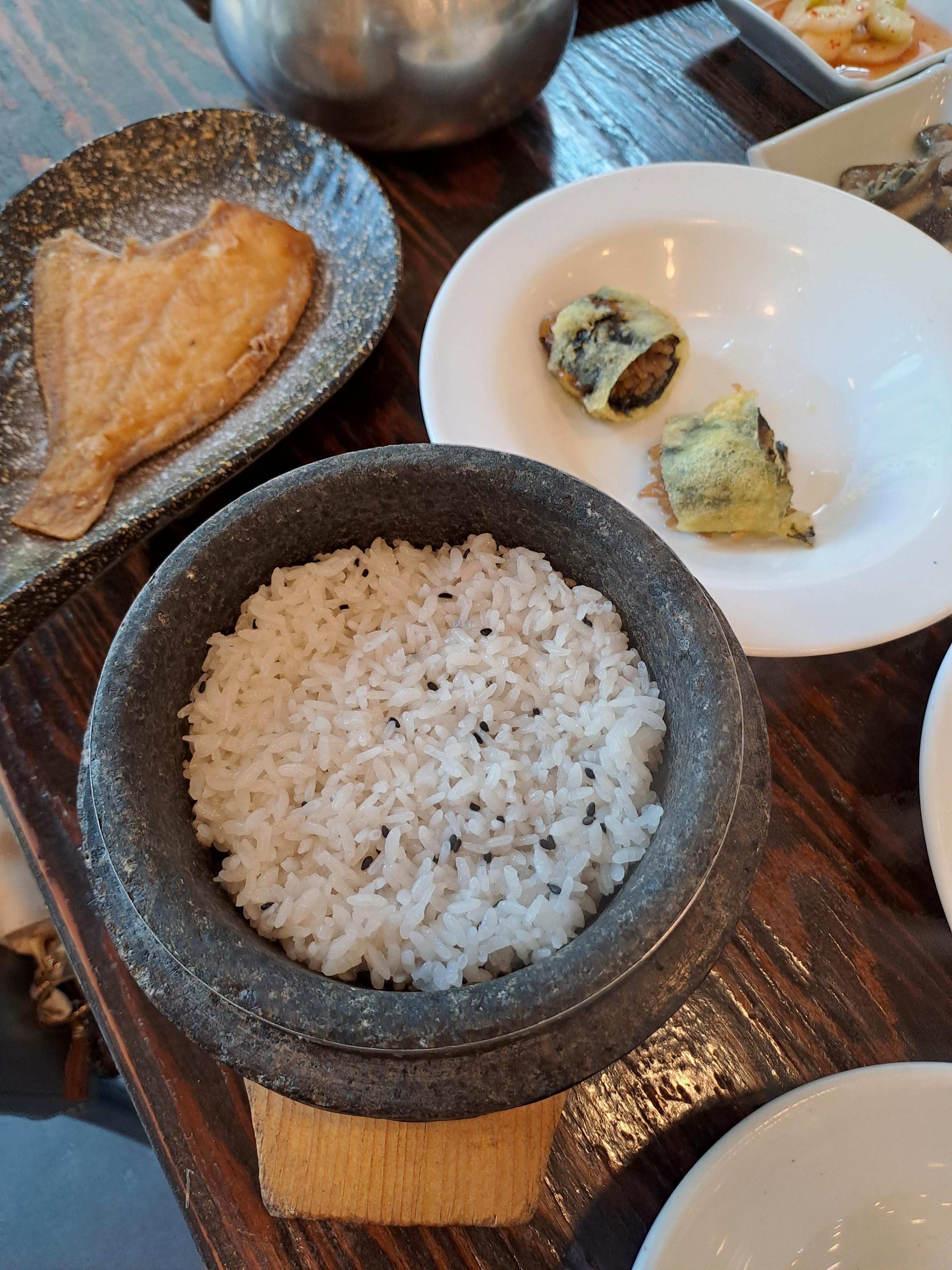 그리고 무엇보다 즐거운 나의집은 돌솥밥이라는 타이틀에 맞게 밥이 정말 고슬고슬하니 맛있다. 비결이 뭔지 ㅎㅎㅎ 쌀을 좋은걸 쓰나? 한솥을 다 먹기엔 양이 많아서 덜어서 포장해 왔는데 이튿날 냉장고에 두었다 전자렌지에 돌려 먹었는데도 여전히 고슬고슬하니 맛있더란 ~~ 아.... 1인당 하나씩 가자미구이도 나오는데 이만하면 정말 한상차림으로 손색없는 듯 ..