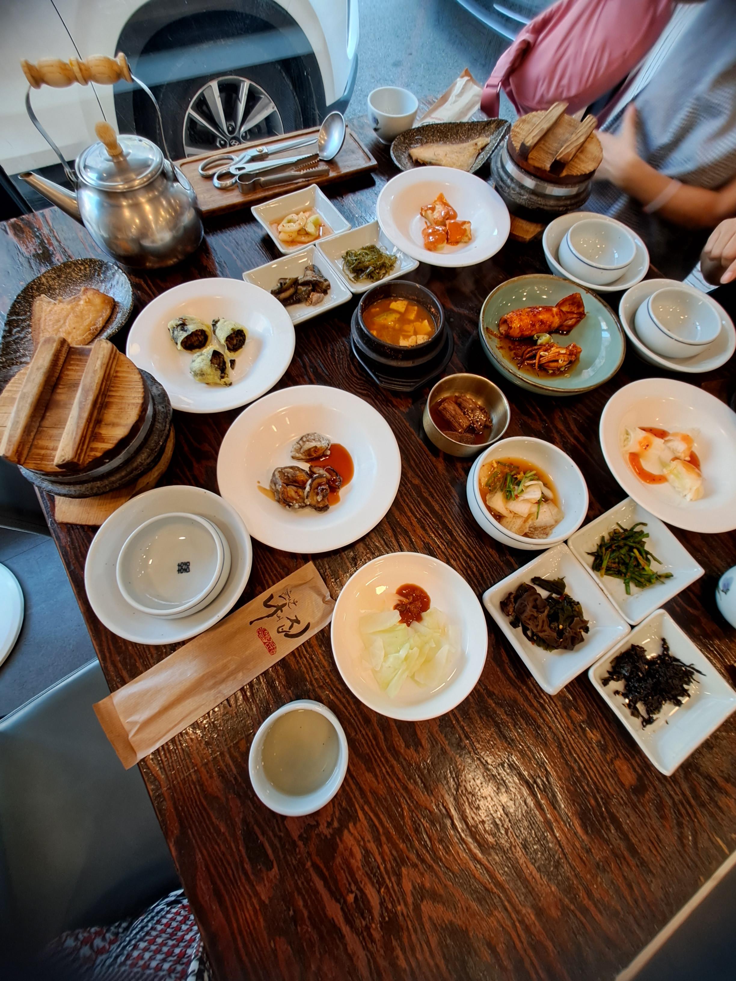 주문을 넣고 조금 기다리면 반찬이 한상에 깔리는데 이집은 반찬을 일일히 하나하나 가져오는게 아니라 밑에 나무 상에