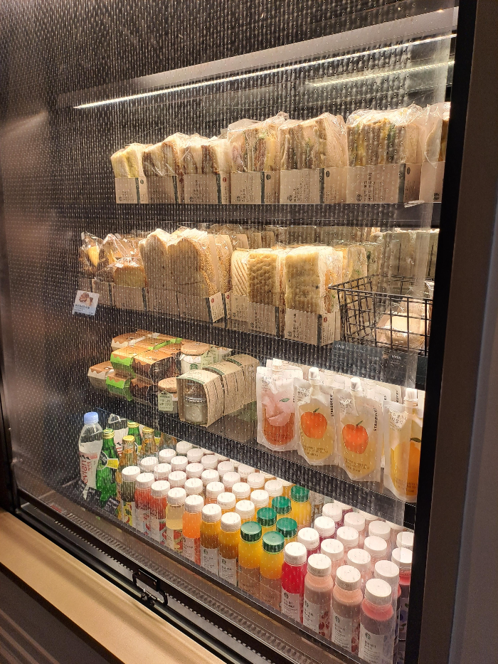 가격은 6300원인가 조금 비싸긴 합니다. 그리고 샌드위치나 케이크 종류는 벽면 쇼케이스에 따로 들어 있어요.