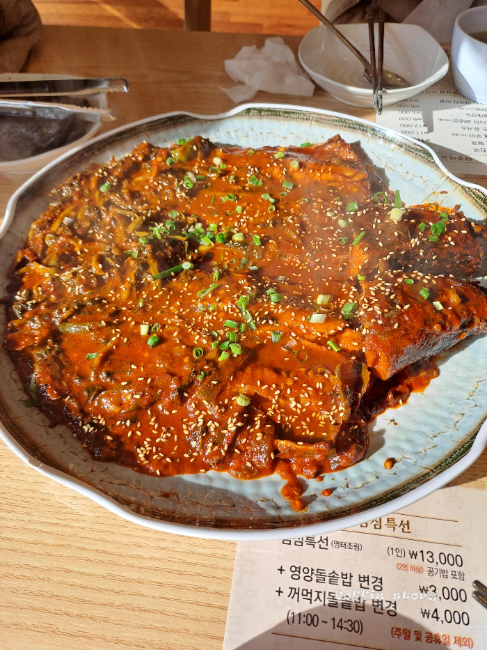 드디어 메인 명태찜이 나왔습니다. 비주얼부터 군침이 싹 돌더라고요~ 양도 넉넉하고 특히 이집 양념맛이 참 좋더라고요. 제가 조림 메뉴를 좀 무서워하는 이유가 언젠가 동네 맛집이라고 소문난 집에 갔다가 맛은 있지만 양념이 너무 달아서 남은 거 포장을 해 왔지만 결국 먹지 못하고 버렸던 적이 있었는데 이 집은 물엿 잔뜩 들어간 달달한 양념이 아니고 적당히 매콤하고요 감칠맛 나는 양념이었어요. 제가 먹어본 명태조림 집 중 이 집이 으뜸이더라고요.