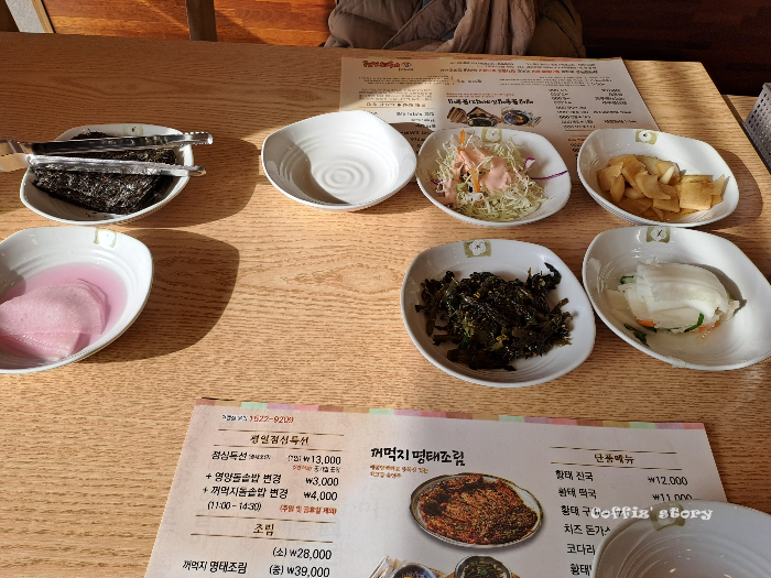 꺼먹지 명태조림의 메뉴는 대략 이렇습니다. 가장 인기가 있는 게 점심 특선이었는데요~ 원래 공깃밥이 포함되어서 1인 1300원이었지만 3천 원 추가하면 영양 돌솥밥으로 변경이 된다고 해서 변경했어요. 명태조림 메뉴 외에도 황태구이나 황탯국, 황태만두, 곤드레 전병, 코다리 회냉면이 있었습니다