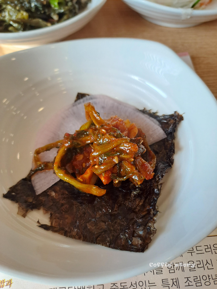 그리고 요 꺼먹지 무침이 반찬으로 나오는데 오 ~~ 이거 정말 맛있습니다. 명태조림에도 들어가 있긴 한데 양념맛에 가려져서 제맛을 느끼기 어려운데 이렇게 담백하게 나오니 왜 꺼먹지에 자부심을 느끼는지 알 것 같더라고요. 일반 무청은 좀 질긴 식감인데 요건 발효를 시켜서 그런지 굉장히 부드럽습니다. 암튼 요거 따로 판매하면 사 오고 싶더라고요.