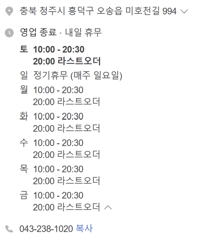 영업시간은 오전 10시부터 오후 8시 반까지 매주 일요일 휴무이며 라스트오더는 오후 8시입니다