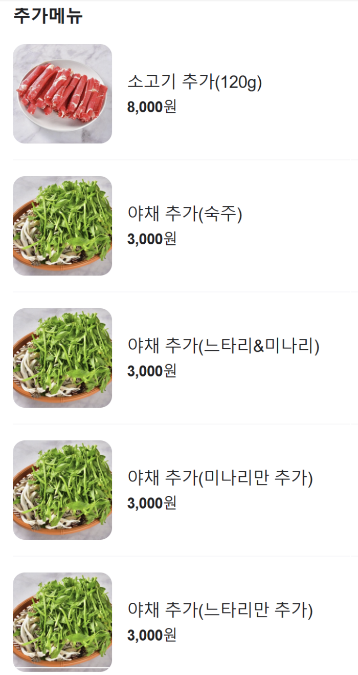 사이드 메뉴는 만두가 있고 추가메뉴로는 고기추가는 7천원 야채추가는 3천 원입니다. 우린 늘 버섯+ 야채 혼합된 거로 추가합니다.