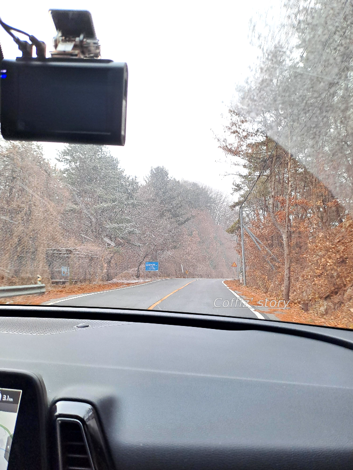 눈이 막 내렸는데 사진에는 표현이 안되어서 아쉬운 그래도 여기가 산길이라서 조금 걱정스럽긴 했는데 제설처리를 해서 도로는 눈이 쌓이지 않았어요.