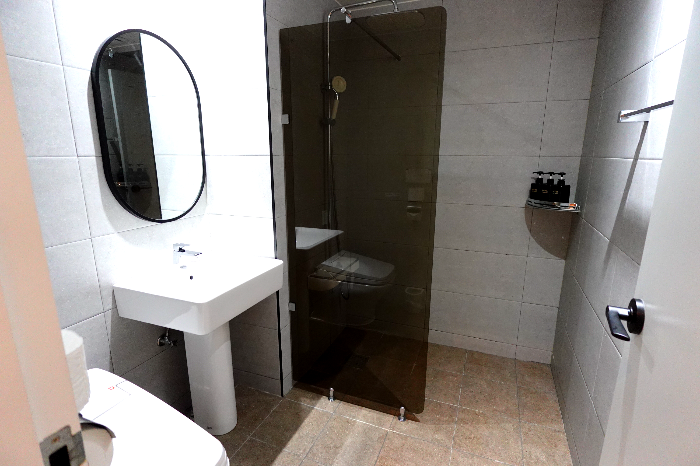 욕실도 청결했고, 샤워부스에 해바라기 수전이 있어 만족스러웠어요. 샴푸, 바디워시, 컨디셔너는 대용량 디스펜서로 제공되고, 기본 어메니티 외에도 약간 놀랄만한(!) 아이템도 포함되어 있었습니다. 😅