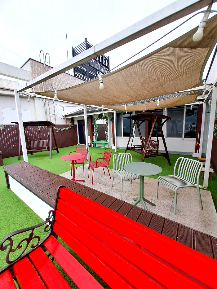 옥상에는 라면 조리기와 전자레인지가 구비된 공용 공간도 있었는데요, 프런트에서 컵라면 구매 후 이곳에서 간단히 요기할 수 있습니다. 루프탑에 흔들의자도 있고 식탁도 있으니 이곳에서 라면 먹음 꿀맛일듯요 저는 비가와서 방에서 먹었기에 아쉽!! 뷰가 좋으니 한번 올라가보시길 추천합니다